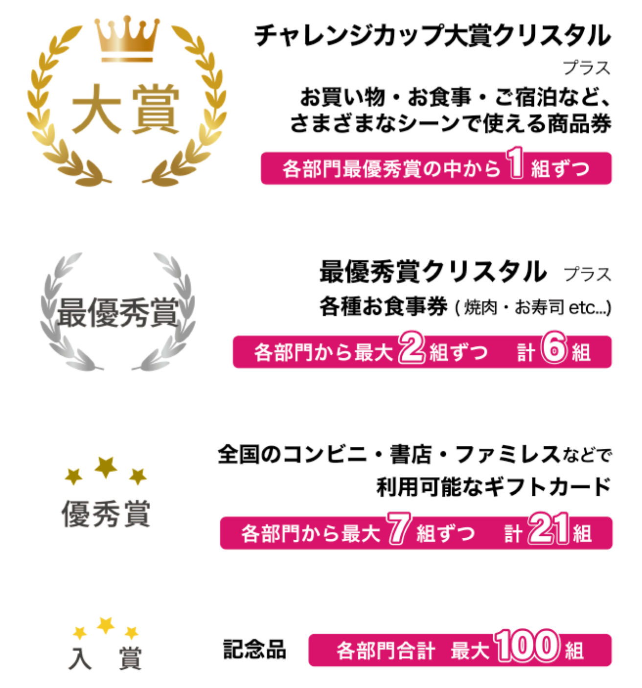 みんなの約半年のチャレンジが「大賞」「各部門最優秀賞」「各部門優秀賞」「入賞」という形で表彰されます。